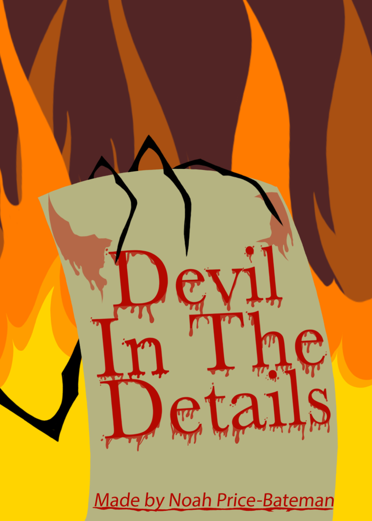 The last cover design, like the last, is also based on more religious fears. However, this time I wanted to go the old ‘Deal with The Devil’ sort of horror. Specifically, I wanted to attract Theophobia which, Lisa Fritscher, a freelance writer and expert in phobias describes as “This phobia involves an irrational fear of religion. However, it may also encompass a fear of enduring “God’s wrath” or a fear of sin. A person with theophobia generally fears that if they sin, they will face God’s punishment.” I also tried to use a bit of conceptual design in this by using blood splatters to create devil horns next to the title, creating an actual Devil in the Details. I also made it so my name was where a signature would be.