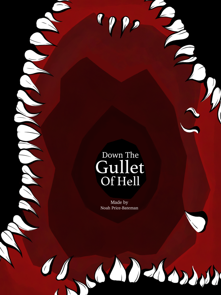 To contrast the first cover design, I wanted a design that’s more straight forward in its horror. Which is why I then created a design that is the inside of an incomprehensible and inhuman beast. I then added the conceptual design of putting the title of the book ‘Down The Gullet Of Hell’ in the gullet of the creature. When it came to the colour scheme, I wanted to keep it simple but in your face, compared to the other two, which is why I chose only three colours: Red, Black and White.