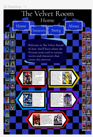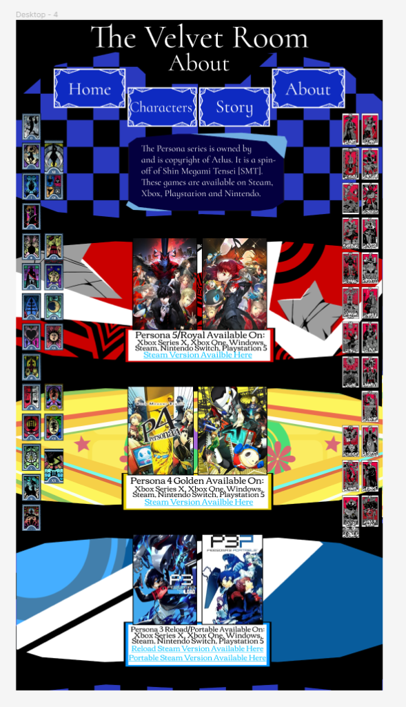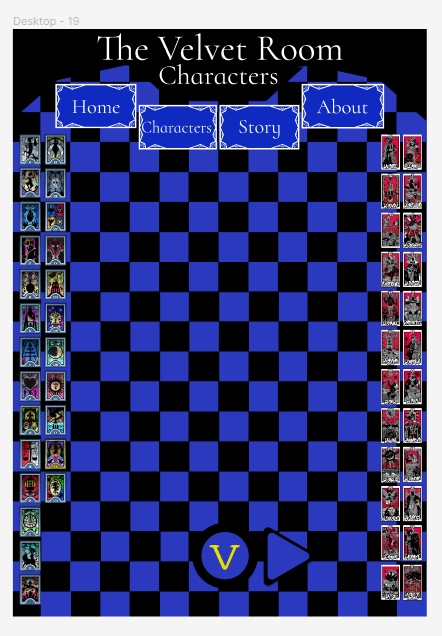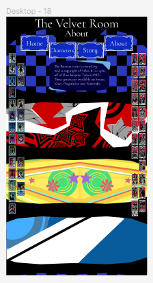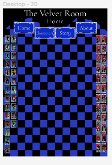 To create a good border, the tarot cards were used and put in order of actual tarot card numbers. This is because they are throughout every persona game, and with their unique designs from P3 and P5, it was best thought that they’d work best as a border, especially for the connecting theme of the Velvet Room, which uses tarot cards the most.