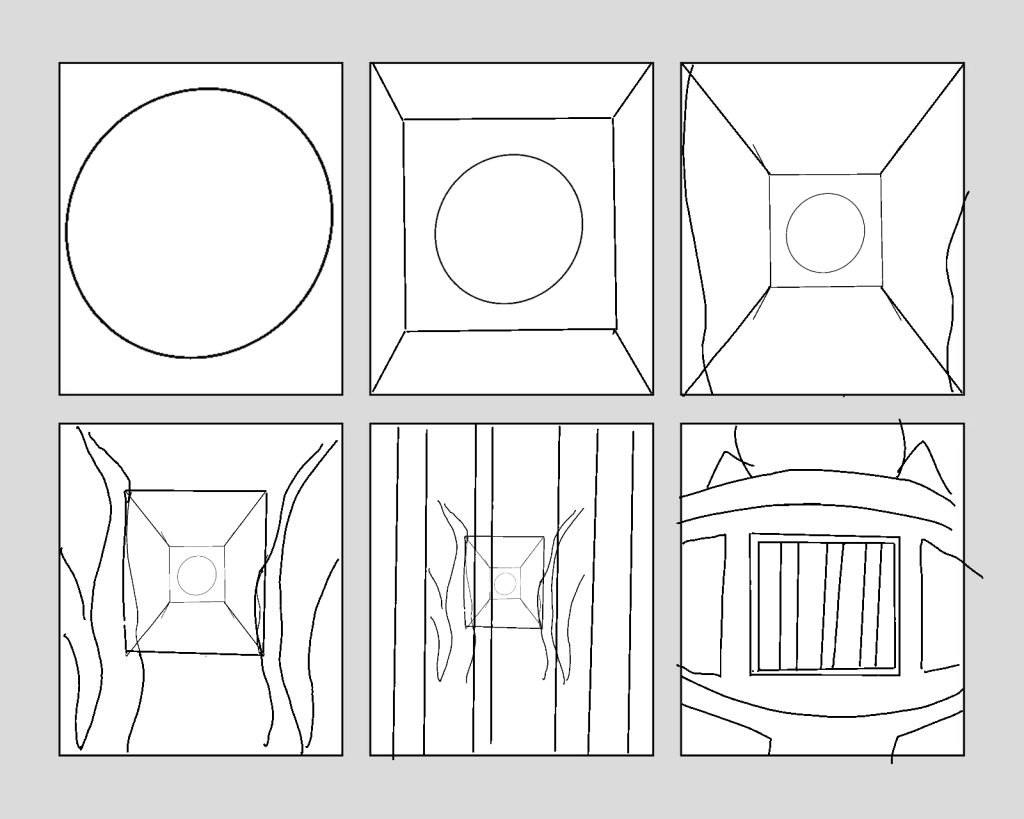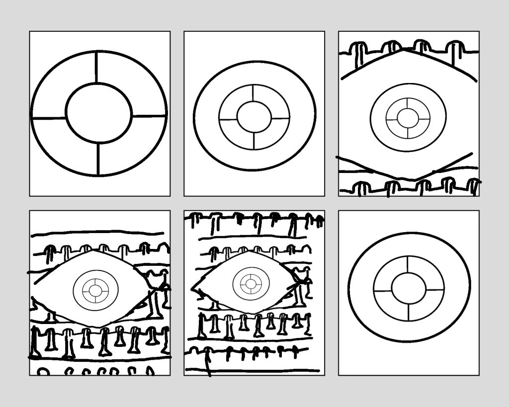 This first storyboard was made to represent the journey through a vent of a machine, before revealing its outwards design. Beginning with a circular object, a gem of some variety, the travel would slowly reveal the mechanical interior covered in flesh that would pulsate, almost as if an infection was in the machine. It would end as it goes through the bars of the vent, slowly revealing the abomination of a machine as the camera panned backwards. Once enough of the machine was revealed, it would come to a halt, holding on the image of this creation, before ending.