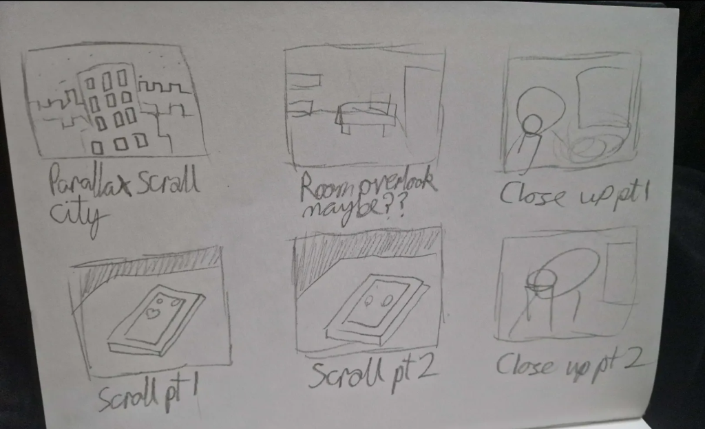 While I have an idea of the design of certain elements, it is best to sketch down the storyboard and initial ideas for the character before making more detailed and digital drawings. This would help in my decision process and if anything needs to be improved.