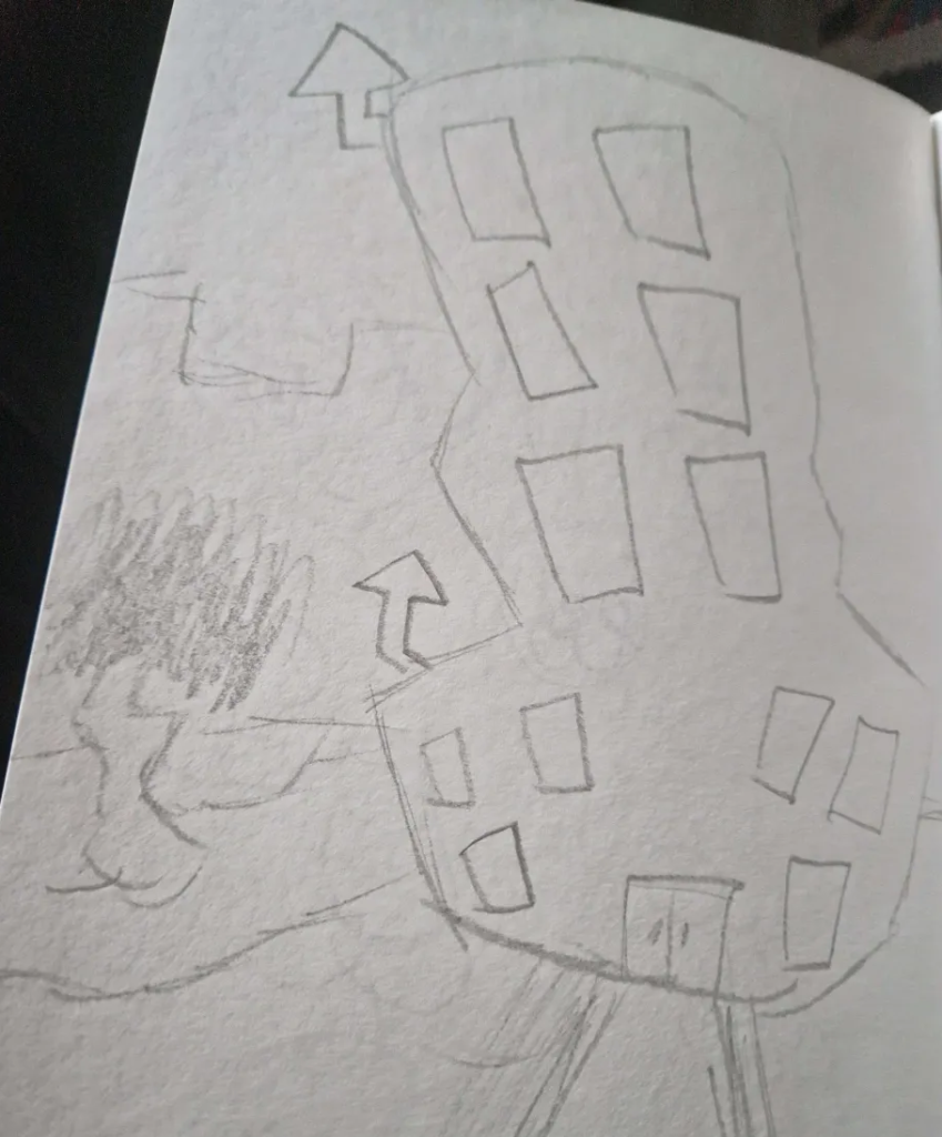 Lastly, I decided to do a quick sketch of the building itself and the surrounding area just so it had a unique design that made it stick out. This was a very quick sketch as it is a small portion of the animation, and its only purpose is to stand out.