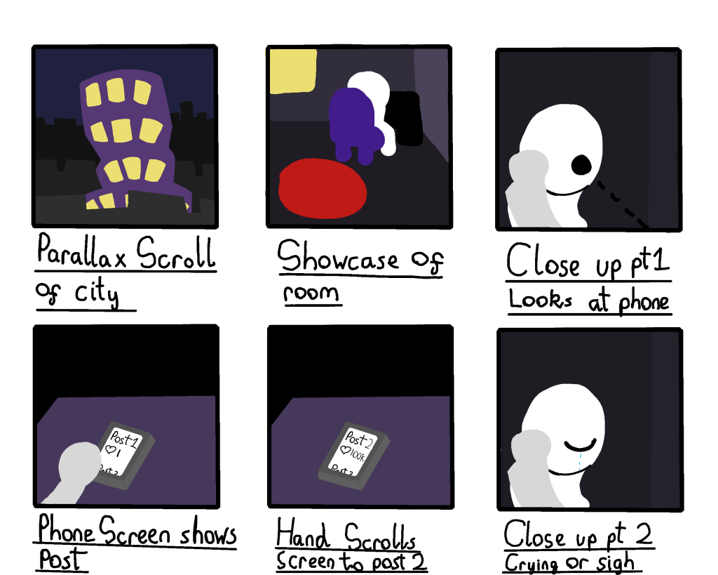 When coming up with the storyboard, I knew I wanted to start with an establishing shot, as they add context to stories, along with being fairly simple to animate. Beyond that, I also decided to have an overhead shot of the room before zooming in on the character as to get an idea of their living area, which on rewatches could show what kind of person the character is. After that, it would go into a close up to finally reveal the character, looking fairly depressed. Any questions on why will be immediately answered upon switching to a shot of the phone, with the character scrolling on a social media app. The scrolling will first show their post performing poorly, and as they scroll down, they see another post which has performed better overall. Lastly, it would cut back to the close up, showing more of their reaction before fading to black.