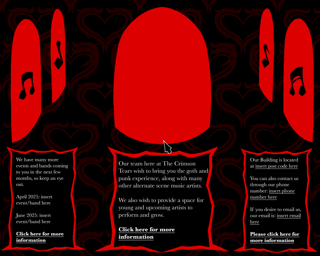 Going back to the Visual Kei Night, I realised their own website could give me a good basis on which to base some of the layout and ideas on. The site itself sticks to the same black red and white colour style that I had leaned into. Along with this, their home page seems to be a collection of information from the other pages, though with more focus on a base introduction.