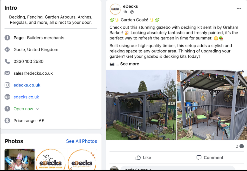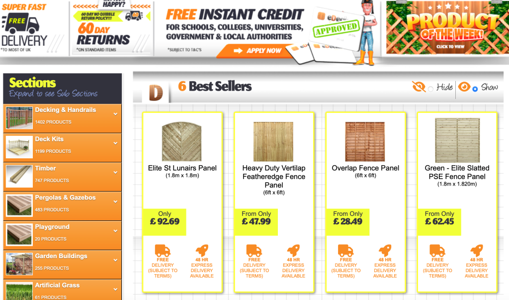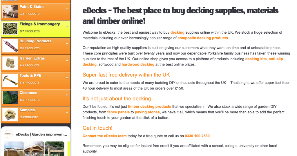 Lastly their tagline is “The best place to buy decking supplies, materials and timber online!” and “Make your Garden Smile!” While not the main area to focus on, perhaps a new tagline could be looked into. After all, a tagline can attract the right people if used correctly and can also help when cultivating a recognisable style. Of course, this depends on how everyone else feels about this choice.