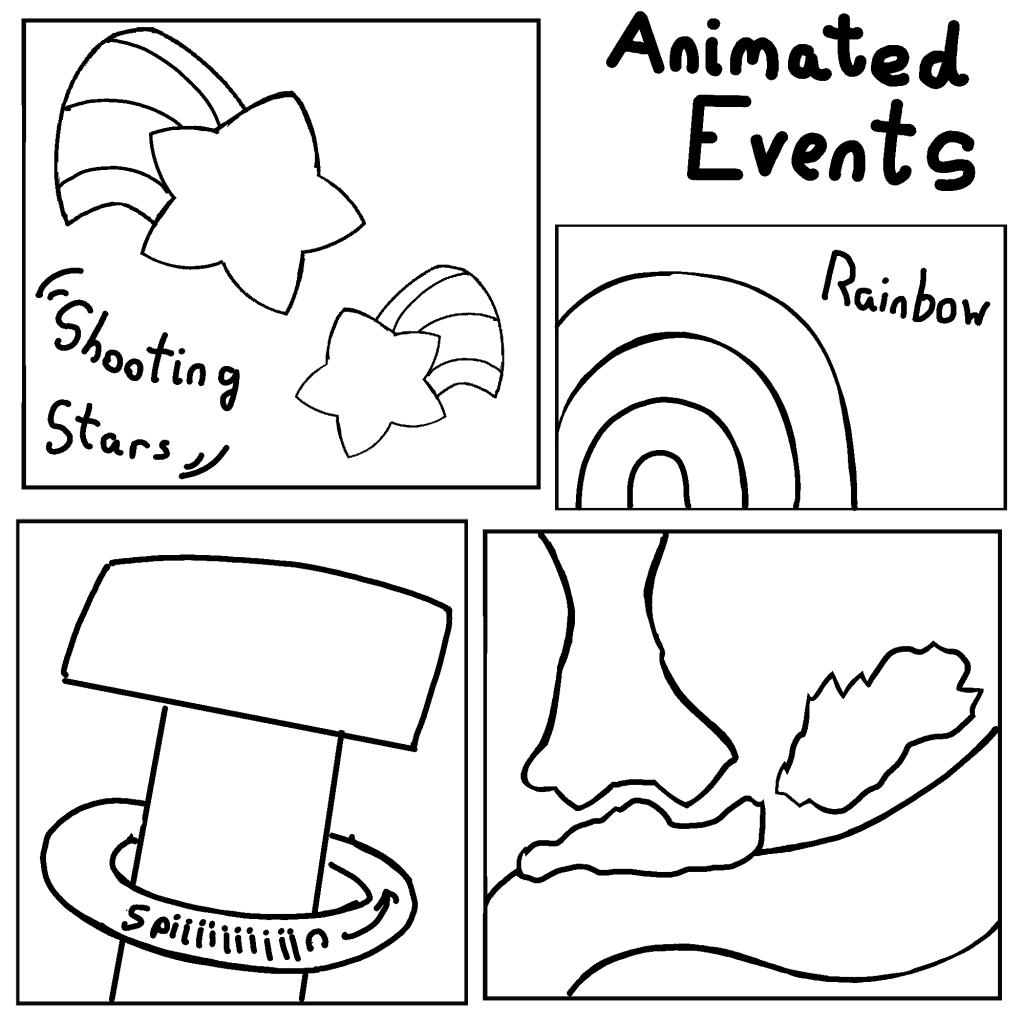 These events range from an object appearing from nowhere. For example: a shooting star from the sky, or a rainbow from behind walls. This could also result in more continuous animated elements, such as a spinning ring around a pillar and a flowing river. These would allow people to find different things upon a rewatch of the area, adding to the whimsy of the overall experience.