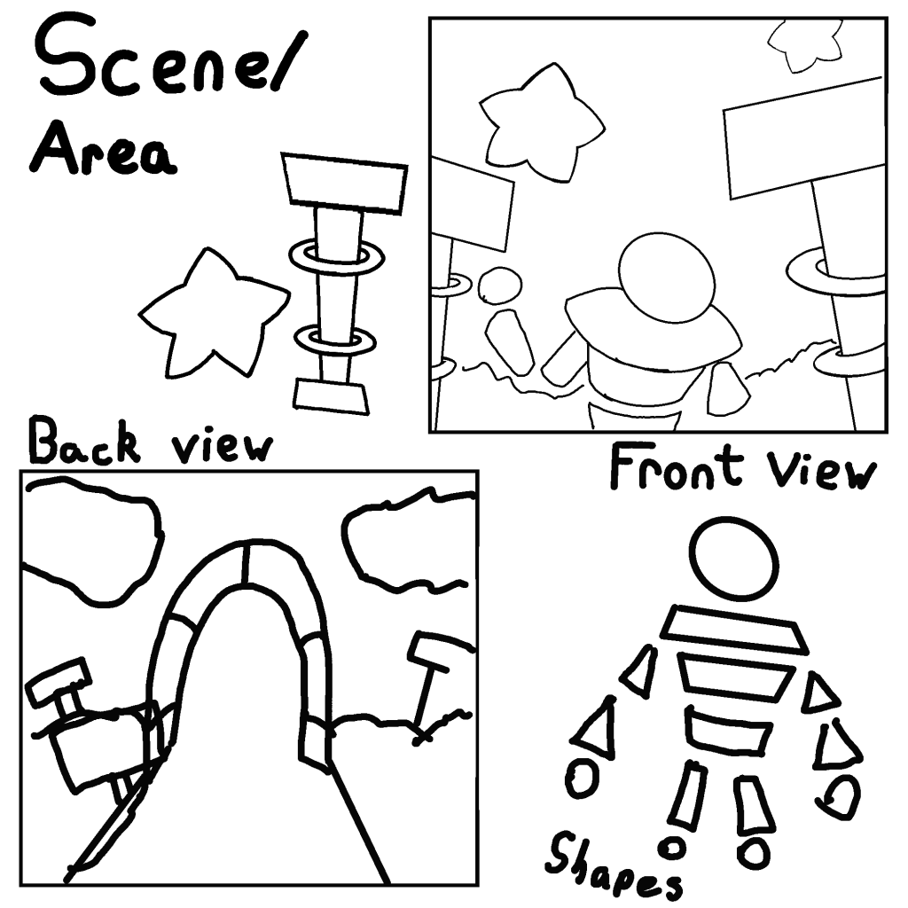 After giving everything a lot of thought and deciding on what I wanted to make, I drafted up a very rough sketch of what the area would look like from a front view, and behind. Along with this, I drew a very rough idea of what objects could be found around the area. From there, I could then decide on how it would all connect to each other.