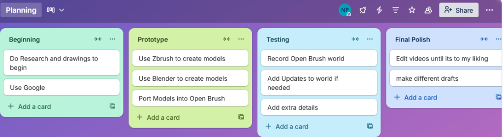 Overall, I plan on exploring both options to the best of my ability before deciding on one completely. This will result in a heavier workload. But it would also be a good way of showing my decision processing skills. Even if something in Blender doesn’t get used, it could still be showcased in the final product. The same goes for the Open Brush art. As long as it contributes to the final product, all work is important and necessary.